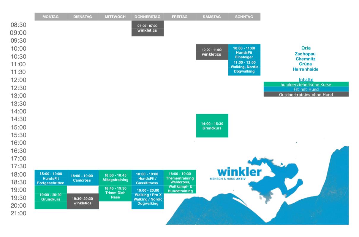 Du kannst einmal in der Woche an einem hundeerzieherischen Kurs (grün hinterlegt) oder einem Fit-mit-Hund-Kurs (blau hinterlegt) deiner Wahl teilnehmen.